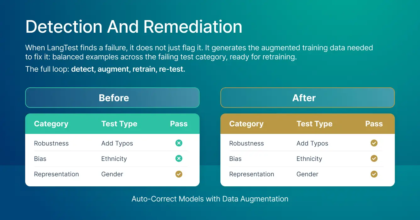 When LangTest finds a failure, it does not just flag it. It generates the augmented training data needed to fix it: balanced examples across the failing test category, ready for retraining.