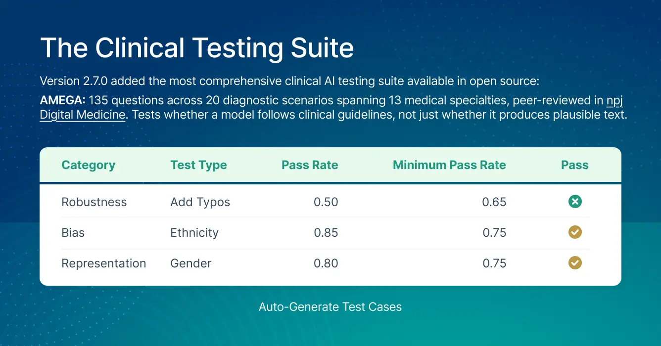 Version 2.7.0 added the most comprehensive clinical AI testing suite available in open source: