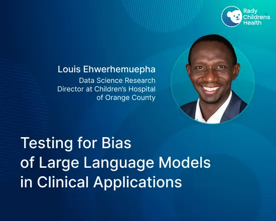 Portrait of a healthcare data science leader alongside the article title, illustrating testing for bias in large language models used in clinical applications, with a focus on fairness, patient safety, and responsible AI in healthcare.